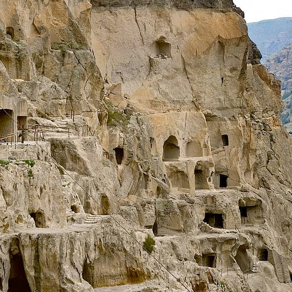 Après le petit déjeuner nous prenons la route vers l’ancienne capitale de Géorgie, vers Mtskheta, située au croisement de la route militaire et la Voie de la Soie. Ici nous visitons les deux monuments du patrimoine mondial de l’UNESCO: le monastère de Djvari (VIe siècle) avec sa vue splendide sur le confluent des rivières Mtkvari et Aragvi et la cathédrale de Svetitskhoveli (XIe siècle), considérée comme l’un des endroits le plus sacré de Géorgie car c’est ici qu’est conservée la tunique qui aurait appartenu au Christ. Dégustation de vins chez Iago. Après le déjeuner, direction vers la ville natale de Staline ou se trouve toujours son musée d’histoire (arrêt-photo), sa maison natale et son propre wagon. Continuation la route vers l’une des plus anciennes villes troglodytes géorgiennes, vers Uplistsikhé (Ier millénaire avant J.-C.), „la cité de Dieu“ avec 150 grottes et des tunnels: un théâtre antique, une pharmacie, des caves à vin, des palais, etc.